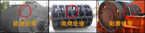 錘式榔頭機轉(zhuǎn)子:普通轉(zhuǎn)子,堆焊焊條的,帶有護圈。普通的錘盤處易受沖擊,需要更換套轉(zhuǎn)子。堆焊焊條的,可以抗擊的沖擊性,當堆焊層磨損完以后需要更換套的轉(zhuǎn)子。帶有護圈的,護圈部分被螺栓固定在錘盤處,磨損完以后直接更換相應(yīng)的護圈,不需要套更換。一下是不同轉(zhuǎn)子對比圖,新鄉(xiāng)鼎力生產(chǎn)的為加護圈的轉(zhuǎn)子。